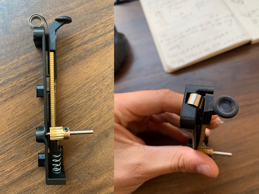 It all started with a set of functional requirements based on design constraints - initial sketches, calculations and prototypes led us down the route of using a rack and pinion for our linear to rotary mechanism. From there, it was constant prototyping (100+ in 3 months), root cause analysis and thinking about design engineering fundamentals to come up with a robust working prototype and test it.
