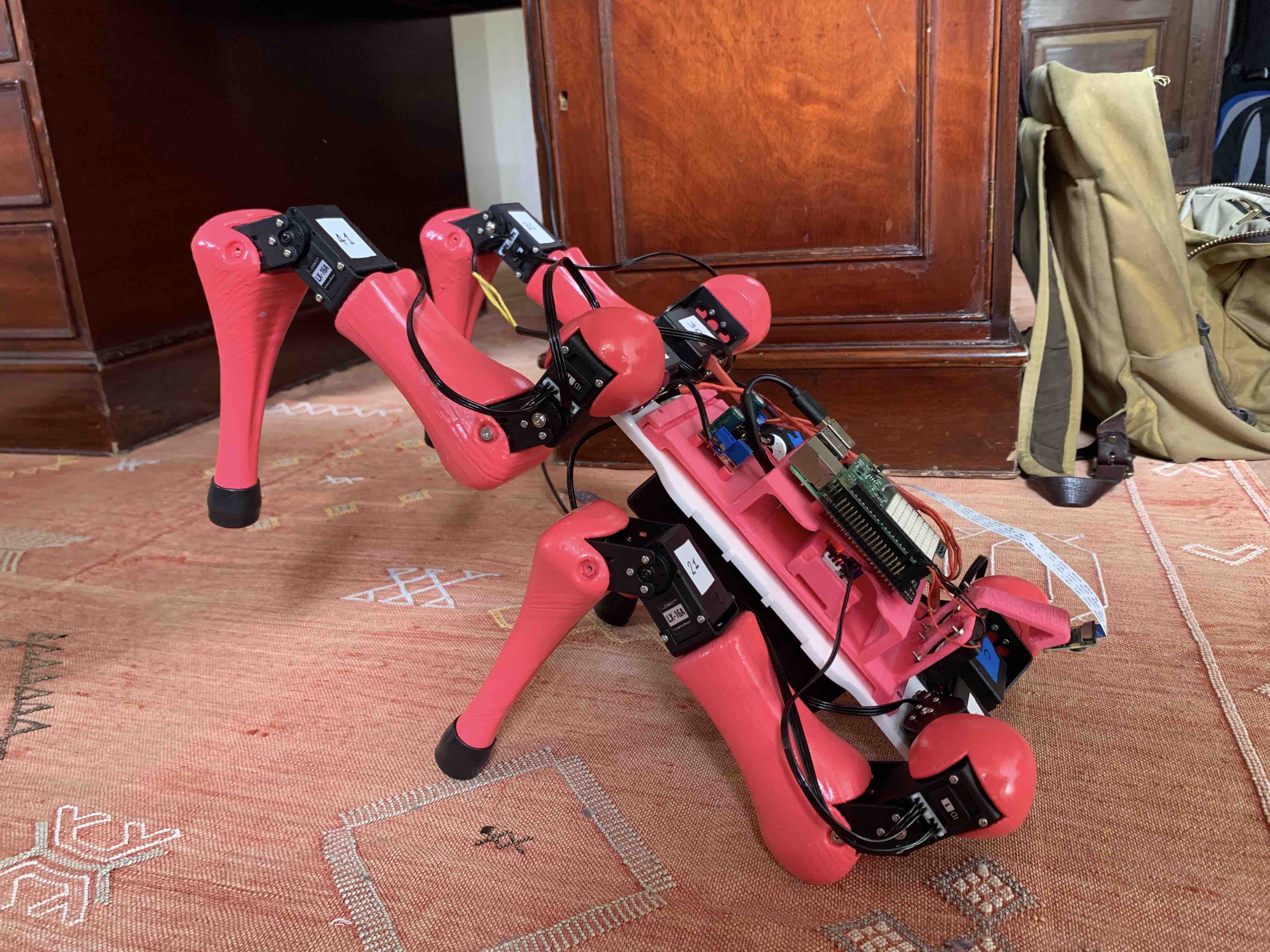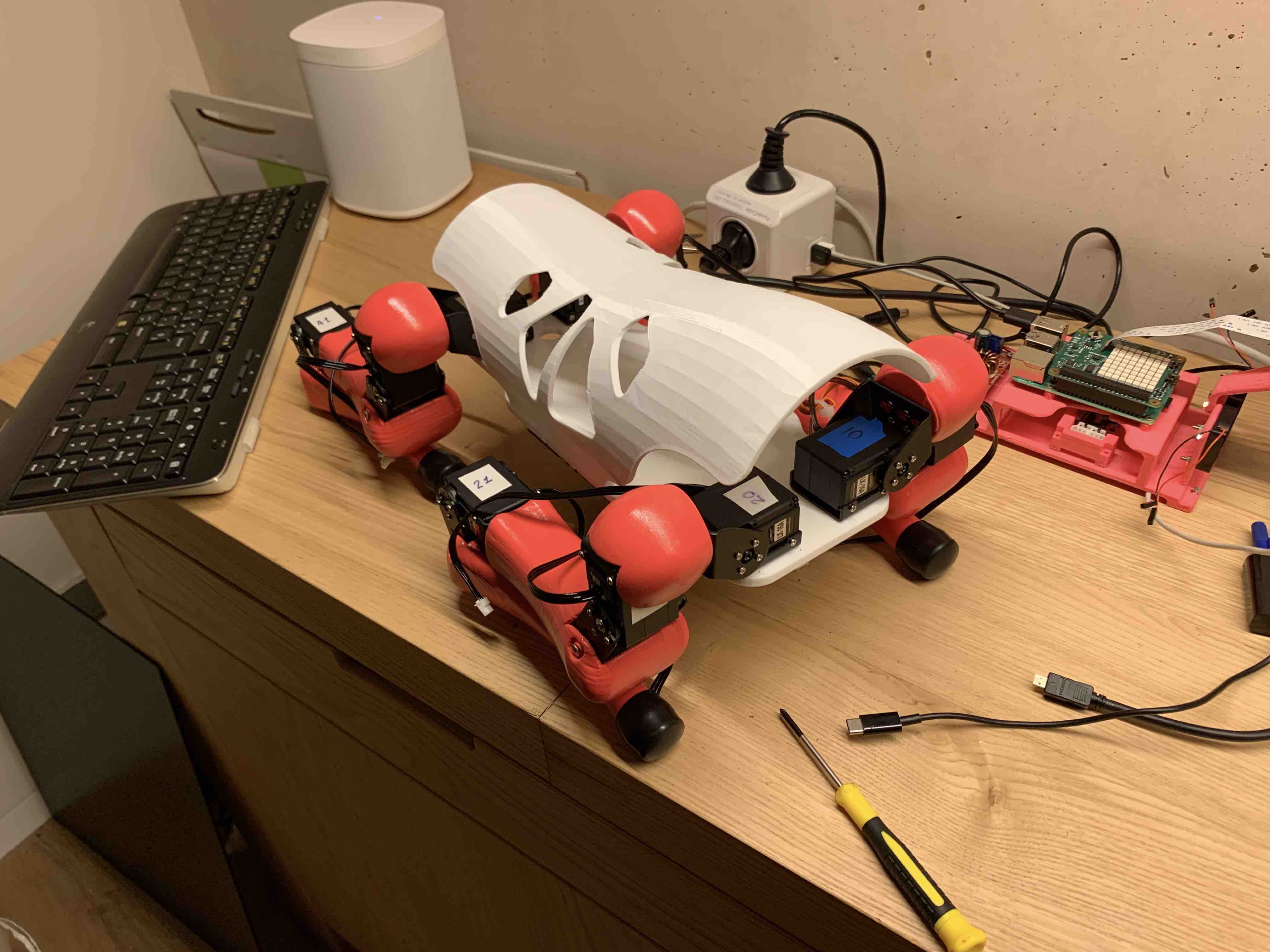 I went from sketches and back of the envelope calculations to Solid Works CAD iterations; from simulations on PyBullet (a physics engine) to a fully built robot walking in the real world. The robot is controlled by a Raspberry-Pi using Python and has 12 DOF. Networking communication is used to run the reinforcement learning policy.