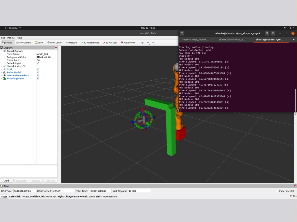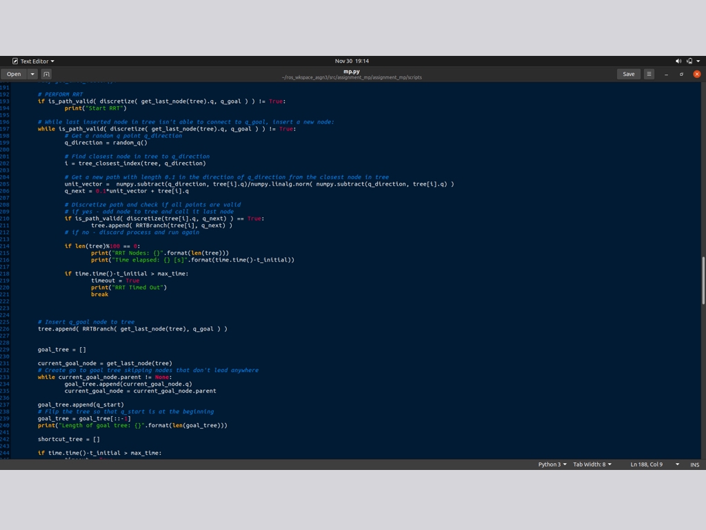 Implemented an RRT (Rapidly-exploring Random Tree) motion planning algorithm in Python for the Kuka arm in an ROS simulated environment (RViz) for my Introduction to Robotics (MECE E4602) course.