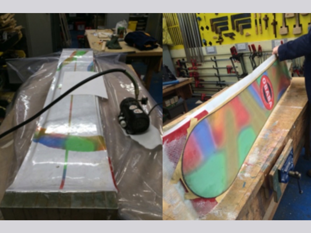 Via months of research and contacting a local snowboard manufacturer in the English midlands, Douk Snowboards, I learnt everything there was to know about the construction process to make my own snowboard. I did everything from gluing poplar core and CNC machining the shape, to layering fiberglass with epoxy and setting it on a vacuum mould - and finally rode it!