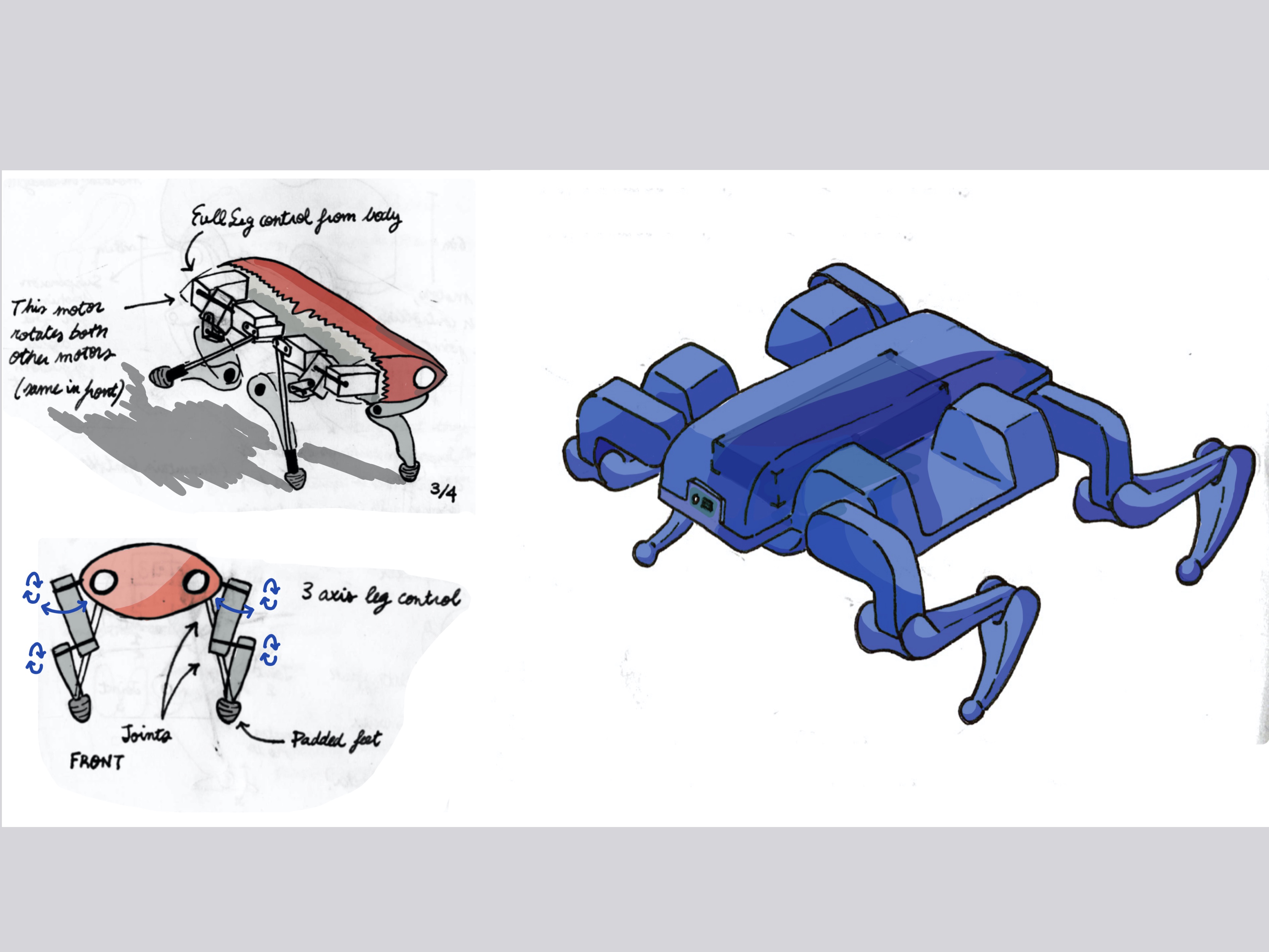 Thus, I made a few sketches which turned into a quick CAD of how I would design a new, smaller quadruped while adding some new features to improve it from its predecessor. I also took this endeavour as a chance to learn Fusion 360 CAD, which I picked up and got comfortable with in a matter of hours.